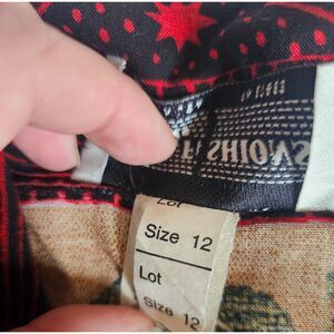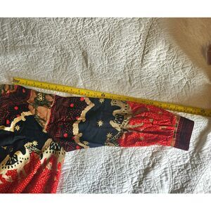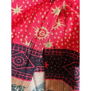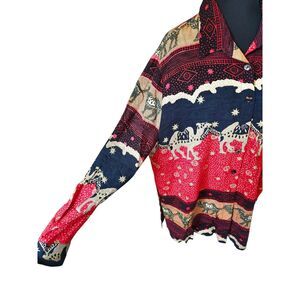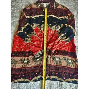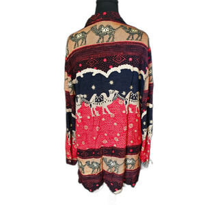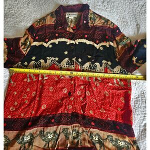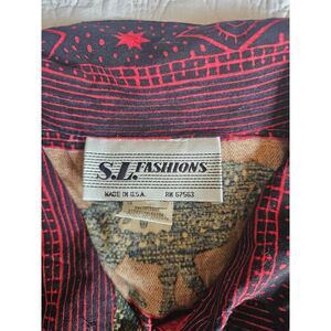 Measurements: 27in long. 23in P2P. 23in arm. The bottom button is missing. Stand out with this eye-catching vintage button-up shirt by S.L. Fashions, proudly made in the USA (RN 67553). Featuring a bold and intricate camel motif in rich tones of red, beige, and black, this long-sleeved top blends boho charm with ethnic-inspired flair. The stylized camels, stars, and geometric bands create a striking visual story across the soft woven fabric.