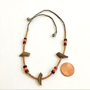 A fun vintage Native American Fetish style necklace. This sweet little necklace would look great layered with other pieces with your favorite Boho or Southwest style outfit. Made with hand carved natural stone beads and liquid silver beads.