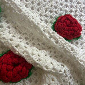 Beautiful crochet blanket featuring red and green floral accents. Perfect for adding a touch of handmade charm to any room. 104 inchX93 inch pictured on a king size mattress. Can fit queen or king… see measurements