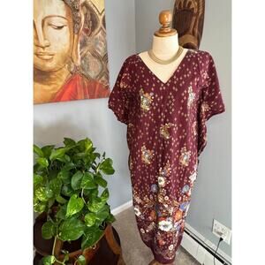 This stunning kaftan features a rich maroon base adorned with delicate gold geometric accents and vibrant floral patterns in shades of blue, white, and red. The relaxed, flowing silhouette offers both comfort and style, perfect for lounging, resort wear, or a chic bohemian look. V-neckline with short sleeves. Lightweight, breathable fabric. Maxi length. Easy, loose fit for all-day comfort. Gorgeous floral detailing along the front. Perfect for casual days, vacation wear, or as an elegant lounge piece. Tiny fabric dye fault in picture 5.