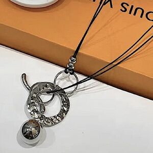 A statement necklace that will be sure to turn heads. A stunning handmade piece that you can dress up or down. A casual maxi dress, tank top with jeans or a sexy shirt dress. Features a silver circle hammered geometric design with a drop ball, leather cord and toggle clasp closure. Artisan design at its finest.