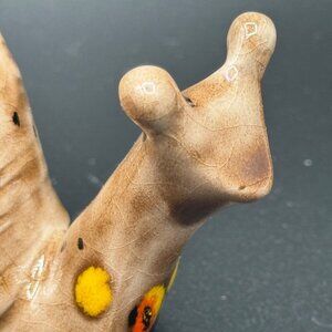 This vintage boho ceramic figurine snail features a hand-painted speckled design in tan, orange, and yellow hues. Perfect for adding a touch of retro charm to your space, reminiscent of the 60s and 70s.