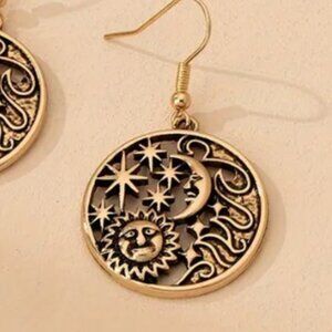 Vintage Boho Hippie Style 18k Gold Plated Sun Moon and Stars Dangle Earrings