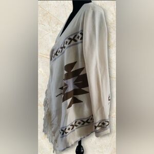 Vintage Geometric Print Wool Blend Southwestern Western Coastal Cowgirl Cottagecore Rodeo Native Aztec Wrap Cover-Up Shaw Cardigan Open Front Fringe Sweater Women's Size Large Poncho