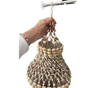 Excellent preowned vintage condition. This lampshade for a chandelier style is hundreds of. Nassa seashells. Crisscross, draped, and looped this lampshade is unique and truly beautiful. In neutral colors alternating with white the shells are strong on wire. Approximately 40 inches long and approximately 12 inches wide in diameter .