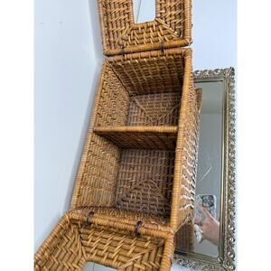 Vintage Boho Rectangular Wicker Storage Basket With Double Bins And Lids, Vintag