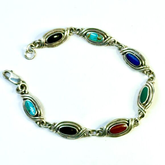 Oval cabochon link design with alternating multicolor stones in turquoise blue, black, red, green, and royal blue (not tested, likely onyx, carnelian, turquoise, lapis) giving a Southwestern / boho look