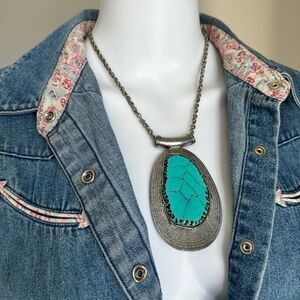 Vintage Boho Silver Tone Turquoise Pendant Necklace