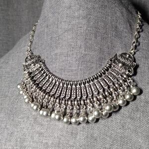 Vintage Boho Silvertone Collar Necklace with Charm Dangles