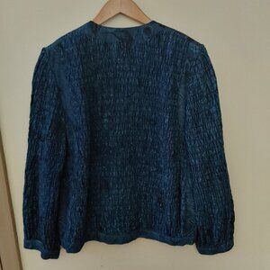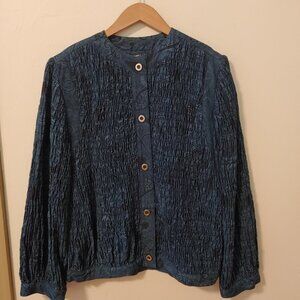 Vintage Denim Smocked Pucker Textured Boho Jacket Front Button Gene Ewing BIS BIS “wrinkled rich denim”. Soft denim, has side pockets.