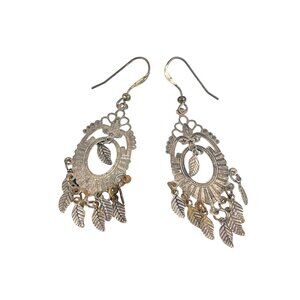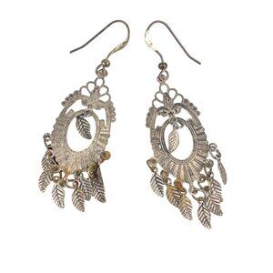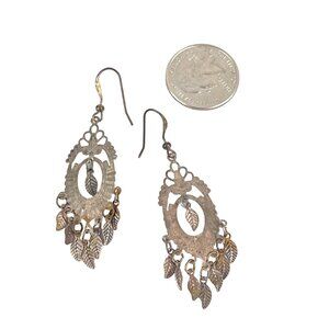 These vintage silver-tone dangle earrings feature an intricate boho design with delicate leaf charms. Measuring approximately 2 inches in length, they offer a unique and stylish addition to any jewelry collection. Their classic, vintage appeal makes them a timeless accessory for various outfits and occasions.
