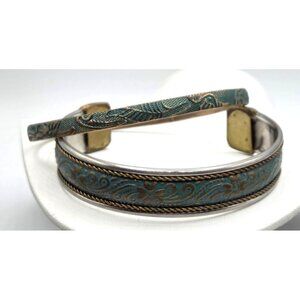 This bracelet set adds a bohemian flair with intricate teal and gold floral etching. The cuff and bangle design offer versatile styling options.