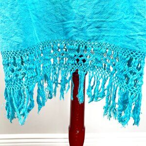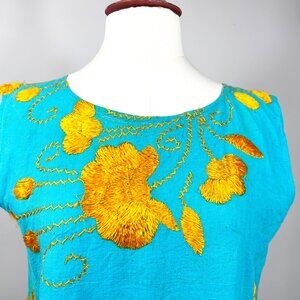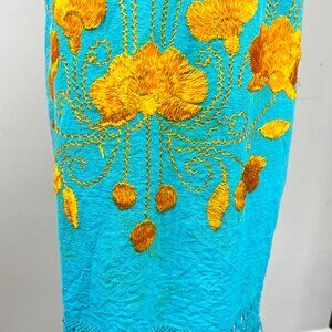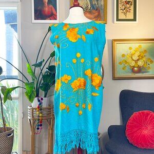 This beautiful vintage turquoise dress with orange/yellow floral embroidery is around 20 years old but still in great condition. All hand made and hand embroidered. Fringing on the bottom of the dress.