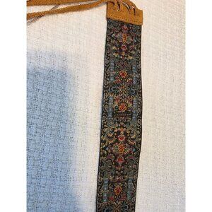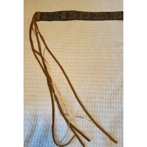 Vintage-inspired boho tapestry belt featuring an ornate woven floral pattern with metallic gold accents and tan suede fringe ties. Adjustable wrap design fits various waist sizes and works beautifully over dresses, tunics, or jeans. Adds a textured, artistic touch to any outfit.