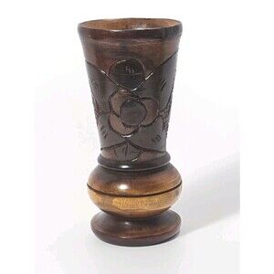 Vintage Boho Tiki Style Hand-Carved Wooden Floral Vase 9” Rustic Folk Art Decor