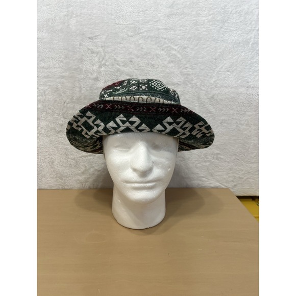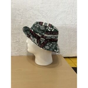 Vintage bucket hat with an all-over boho / tribal geometric pattern in green, burgundy, cream, and black. Made in Thailand with a soft black fabric lining for comfort.