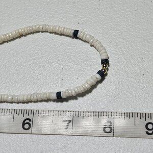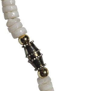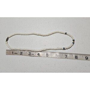 This vintage Heishi bead necklace features white and blue beads with metal accents. A unique piece for adding a touch of elegance to any ensemble.