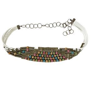 Vintage Boho White Leather Multi Strand Chain Link Belt w/ Wood + Metal Beads