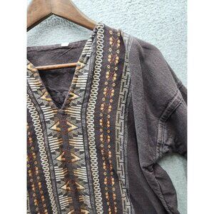 Vintage Boho-Inspired Brown Tunic Top With Tribal Embroidery 3/4 Sleeves V-Neck