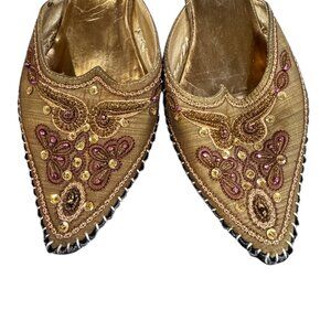 Step into vintage glam with these stunning Bolaro beaded genie-style slip-on shoes. Featuring intricate gold embroidery, pink beaded accents, and a pointed toe silhouette, these statement shoes bring a luxurious, bohemian flair to any outfit.