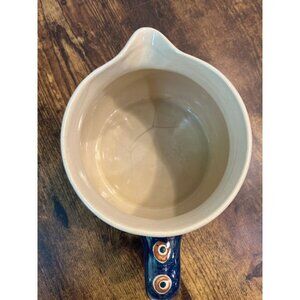 This vintage Polish stoneware pitcher showcases the iconic Peacock Eye pattern, a hallmark of mid-20th century Boleslawiec craftsmanship. Its timeless design and functionality make it an excellent addition to traditional and contemporary collections alike. Dishwasher and microwave safe. Makers mark on bottom.