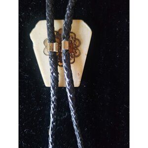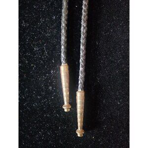 Vintage Bolo tie gold Jet flakes silver ends black leather braid