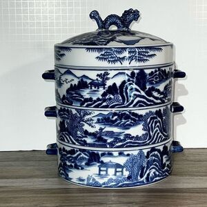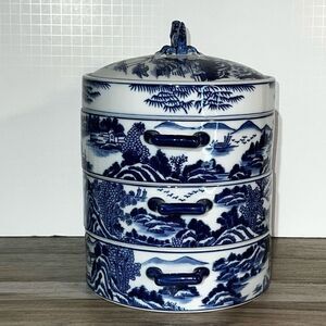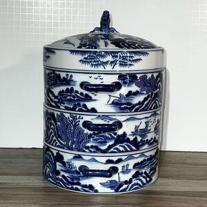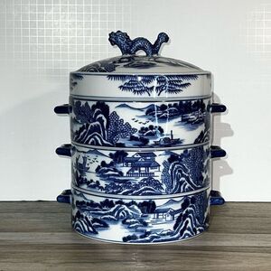 Vintage Bombay Chinese Dragon Dumpling Dish Blue Willow 3 Stacking Box Covered