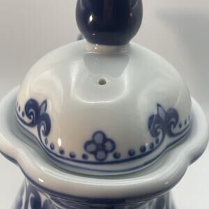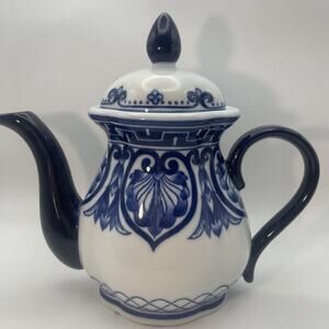 This Vintage Bombay Company Blue and White Tea Pot with Lid features a charming floral motif in a classic French style. Made of porcelain, this medium-sized teapot is perfect for all occasions and adds a touch of elegance to any kitchen or dining room. The blue and white color scheme and intricate design make it a unique and stylish addition to any collection of dinnerware and serveware. Black on bottom can be removed requires scraping.