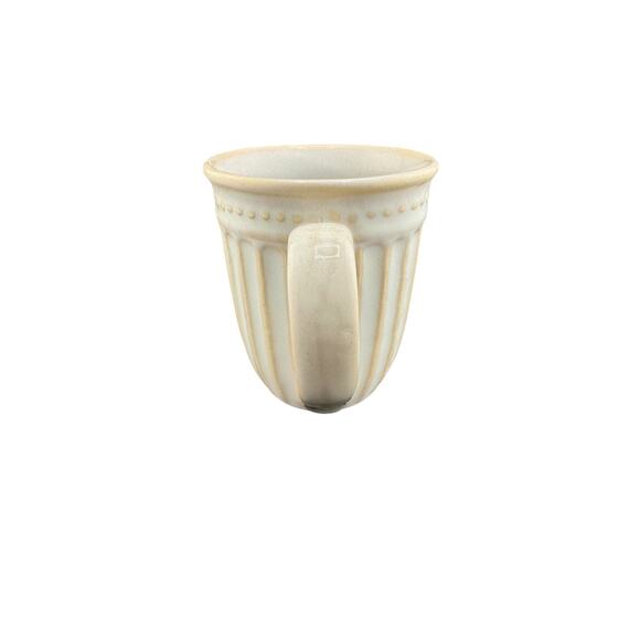 This set of mugs is beige with darker tan accents. They have dots at the top and fluting down the sides. Perfect for every morning.