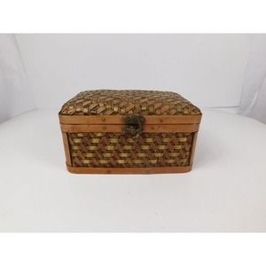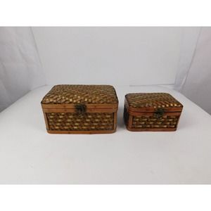 Vintage Bombay Set of 2 Nesting Wood Metal Woven Storage Boxes Hinged Lids Latch