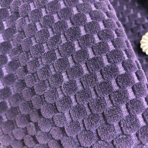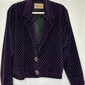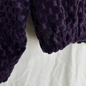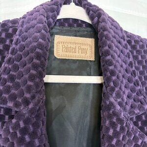 Vintage bobble purple velour bomber jacket from Painted Pony. Size tag is missing but I would peg it at a Large - see measurements below. The interior armpit areas appear to have been ripped and was mended in a not great fashion, but the exterior is in fantastic shape! Original buttons and two pockets make this the perfect fall layer. So chic and classy! Bought for myself to wear but it just doesn't quite fit. Stretch waist approximately 21 in., pit to pit approx. 24 in., arm length shoulder to cuff approx 23 in.