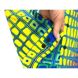 This Vintage Button Up Bon Homme is very colorful and has a super fun pattern. It features a front pocket and buttons at the hem at the sides (see photo). It's preowned and in excellent condition.