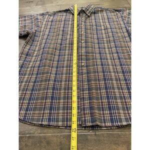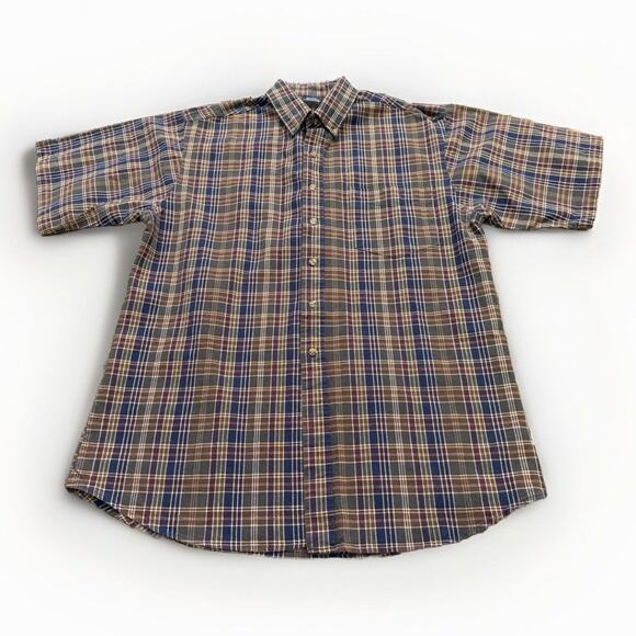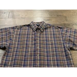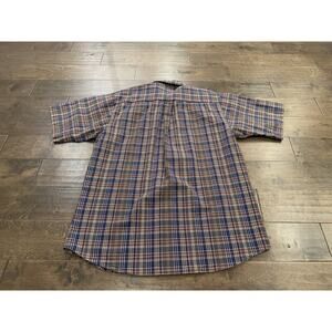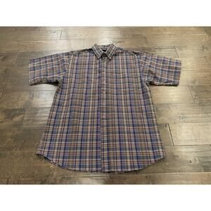 Vintage Bon Homme Mens Brown Blue Plaid Button Up Short Sleeve Shirt Size L
