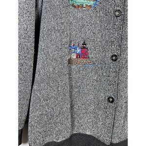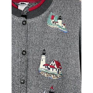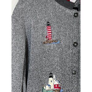 Vintage Bon Worth Cardigan 2X Gray Lighthouse Embroidery Coastal Nautical Artsy