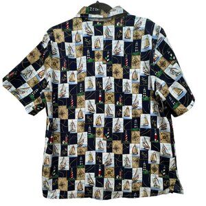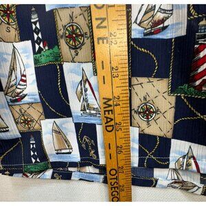This Vintage BonWorth nautical-themed shirt features a vibrant design with sailboats and lighthouses. Made for comfort and style, it's ideal for casual outings.