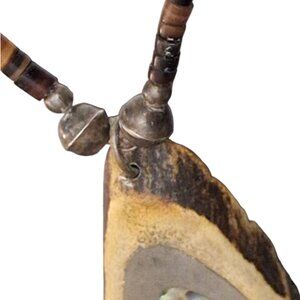 Very rare bone bead necklace with sliced antler bone inlaid with silver and mothers of pearl pendant. Eight and ½ inches long with a barrel clasp. Excellent vintage condition. Needs a good cleaning and polishing. Interested, make an offer. From a smoke and pet hair free home..