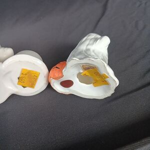 There is dark brown stain in the candleholder part where a candle was probably allowed to burn too low. The small ghost with the pumpkin on his head has some orange missing from the pumpkin on the back. There's some rough edges along the bottom edges of the 2 smaller pieces. and possible a tiny chip or 2...but it could just be that that was how it was made. Its hard to tell really.