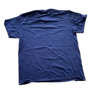 This navy blue tee, in size large, features a distinctive graphic that's sure to turn heads. The shirt is in good used condition and does show some signs of wear. Plenty of life left and ready for a new home.