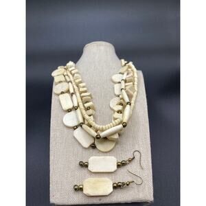 Wonderful vintage multi-strand bone necklace and matching earrings. It may be from Africa. The bone (bead) cuts are of different sizes and shapes. With antique gold colored bead dividers and a hook clasp. 23-1/2" long. There is no artist signature.