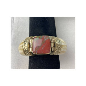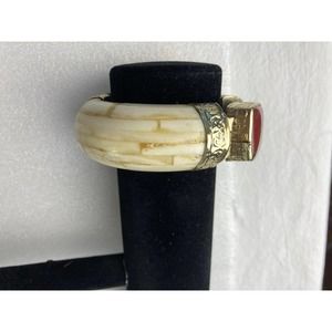 Vintage Bone Ornate Bracelet Red Agate Cabochon Silver Tone Bohemian Pin Closure