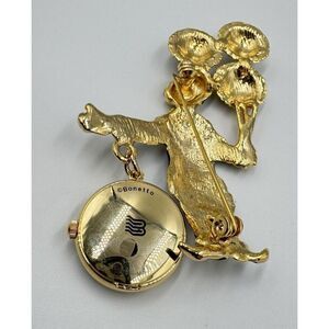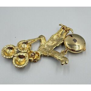 Such a fun brooch watch. Pave rhinestone balloons, bright red nose and a working dangle clock. Few scuffs on black paint, no other condition issues.