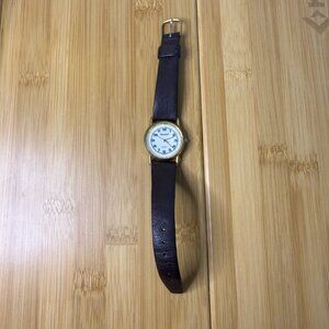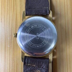 Great condition! Runs great with a brand new battery. Some cosmetic wear as expected for a vintage item. Gold metal case with a brown genuine leather strap. White dial with black and gold accents and a crystal accent at the 12 o'clock position