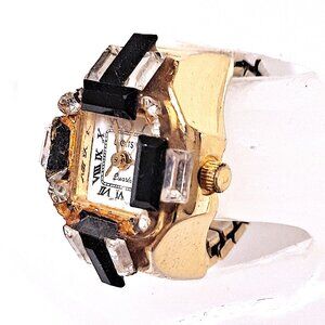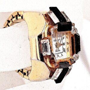 -Gold dial with black Roman numerals and a rhinestone at 12 o'clock