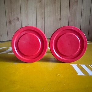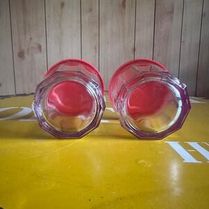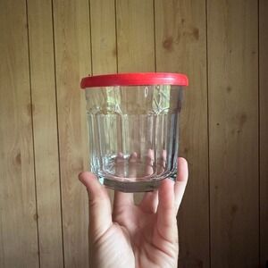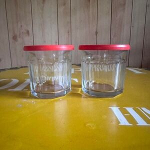 Dos frascos de cristal grueso con tapa plástica roja, perfectos para almacenar o decorar. Detalle grabado en relieve: "Bonne Maman." Estilo francés rústico ideal para cocina vintage.