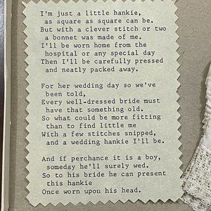 Vintage (60 years old) 'I'm just a little hankie' poem with the bonnet/hankie. In its original box, in excellent vintage condition with no stains or discoloration. Bonnet is gorgeous! It is newborn size or just something special to add to your vintage collection ❤️. Makes a super cute baby shower gift for a mom that loves vintage!