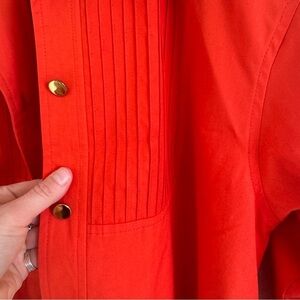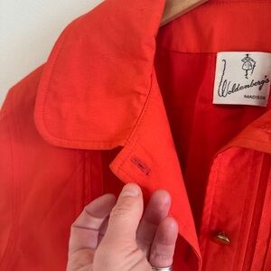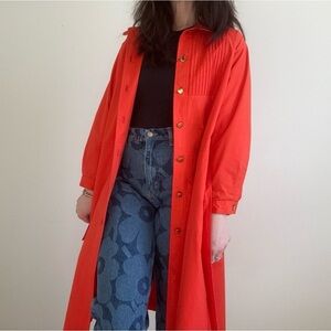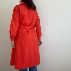 What a showstopper!!! Vintage 60s 70s Bonnie Cashin for Russ Taylor trench coat. Vibrant tomato red color with a poppy orange undertone. Gold buttons.
