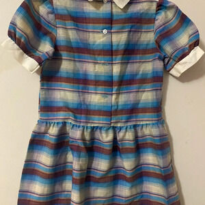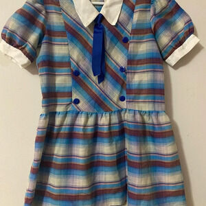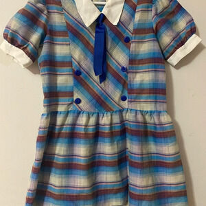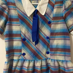 Vintage Bonnie Jean Dress Short sleeve blue plaid drop waist dress White collar and blue ribbon Button up back Size 6 Smoke free home