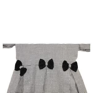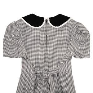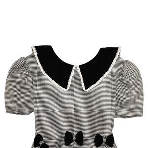 Charming vintage-inspired girls’ dress by Bonnie Jean New York, featuring a timeless black-and-white houndstooth pattern with a velvet Peter Pan collar, lace trim, and four velvet bows across the waistline. Short puff sleeves and a long, flowing skirt with a tie-back sash give it a classic silhouette. Hidden back zipper closure.