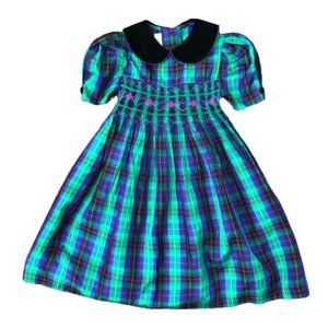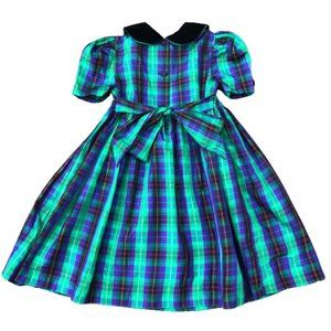 Vintage Bonnie Jean Girls Formal Plaid Puff Sleeve Peter Pan Collar Tie Bow Back Party Dress