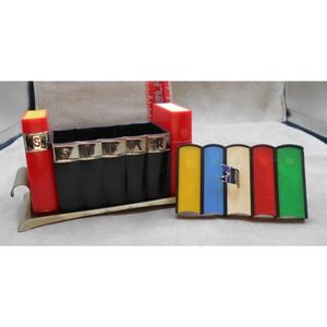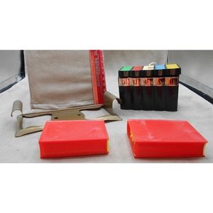 Vintage Bookshelf Salt & Pepper Shaker Set w/Sugar Container Davis Prod. 1950s. Vintage/retro novelty salt and pepper set. Great for a book lover, or a librarian, as a gift! Red books are the salt and pepper shakers, the black books are a container for sugar. and they all sit on a metal base! Nice condition except for the pepper shaker is missing the 'P'. Please see pictures.
